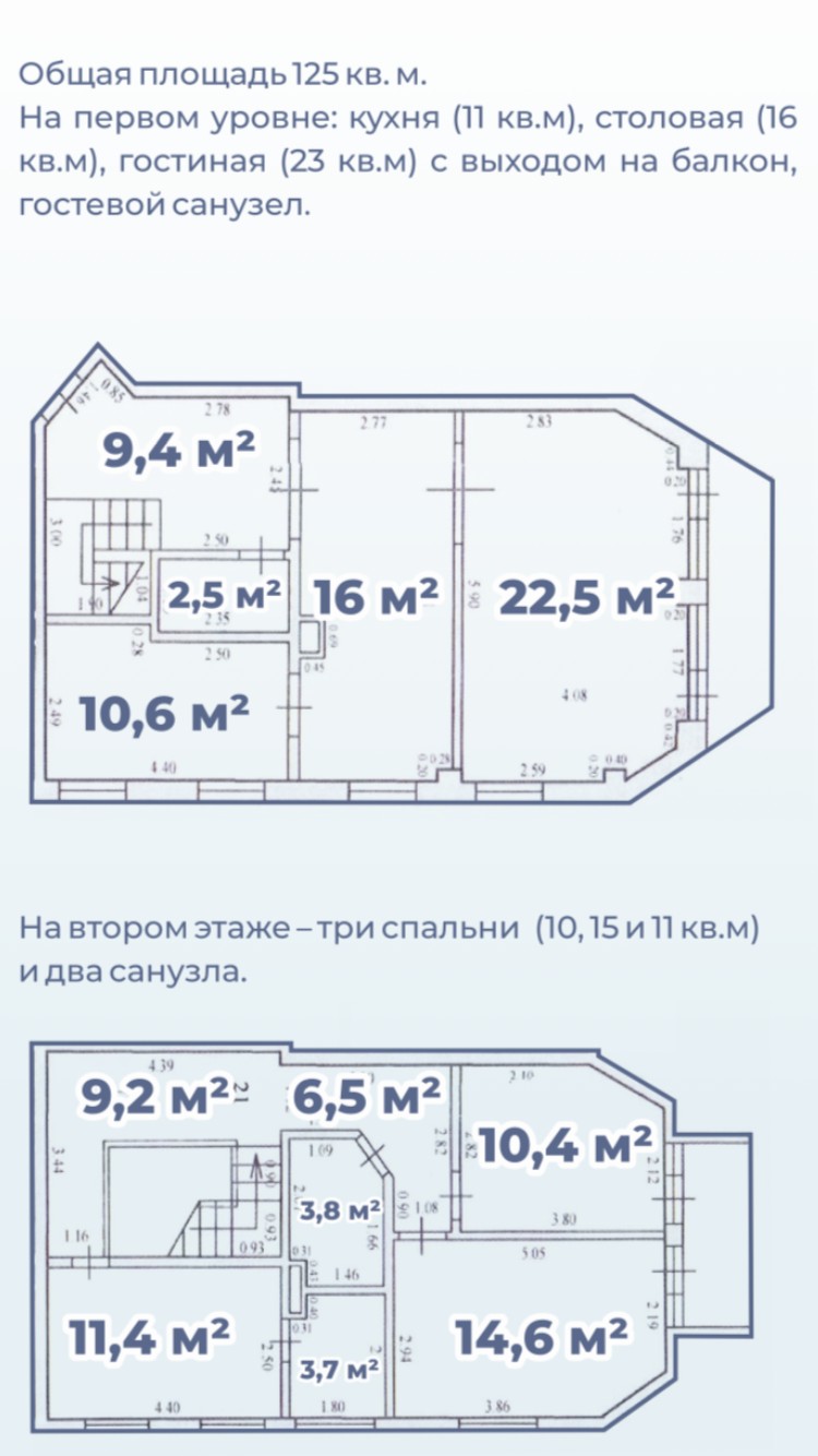 Срочно продам комфортную суперкачественную и недорогую 5-ти комнатную квартиру площадью 125 кв. м. Двухуровневая квартира расположена на верхних этажах здания (третий этаж и мансарда). На первом уровне: кухня, столовая, гостиная с выходом на балкон, гостевой санузел; на втором – три спальни и два санузла. В цокольном этаже с автоматическими воротами расположен паркинг, в котором за этой квартирой закреплены два парковочных места и кладовка (площадь
